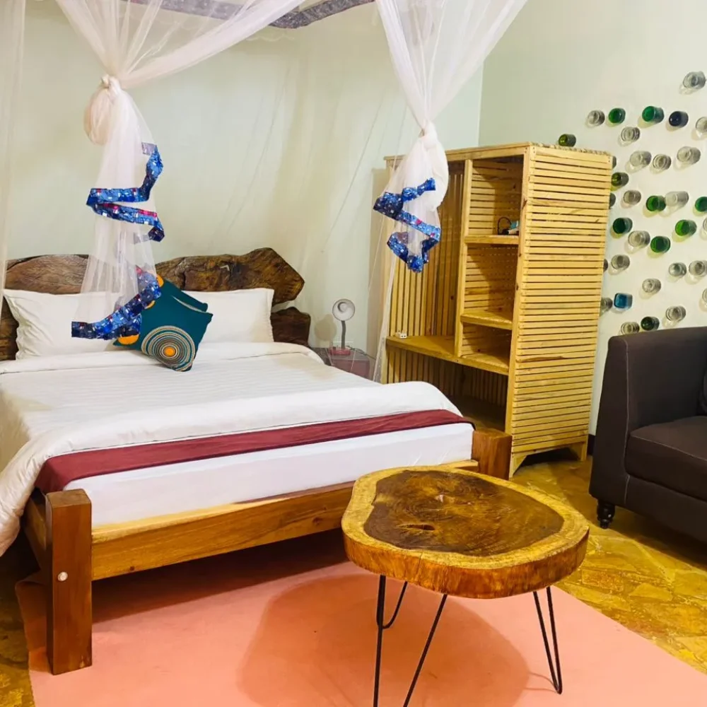 The room features a well-appointed sleeping arrangement with double and single bed options, making it ideal for couples, families, or small groups. Designed with local stone flooring in both the room and washroom, the cottage reflects a natural and elegant style while ensuring durability and comfort.